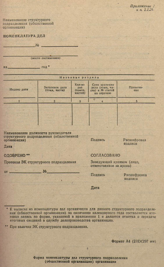 Номенклатура дел организации печатается в нескольких экземплярах. Первый экземпляр (контрольный) хранится в канцелярии (у секретаря–референта), второй - используется в качестве рабочего экземпляра, третий - находится у лица, ответственного за архив в качестве учетного документа, четвертый - в государственном архиве, если организация передает свои документы на хранение в госархив[5].