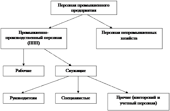 В литературе встречается классификация, согласно которой весь персонал предприятия делится на две группы: промышленно-производственный персонал (ППП) и персонал непромышленных хозяйств [31, C. 112]. В свою очередь, по классификации других авторов, работники ППП подразделяются на рабочих и служащих [20, C. 84]. В составе служащих выделяют руководителей, специалистов и др. служащих (конторский, учетный персонал) [28, C. 137].