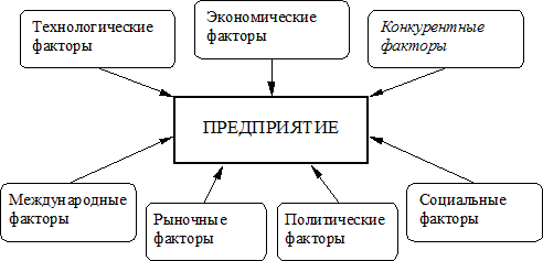 Внешние синтетические факторы в условиях рыночных отношений способствуют формированию качества продукции. Внешняя или окружающая среда является неотъемлемым условием существования любого предприятия и является по отношению к нему неконтролируемым фактором. Все воздействие внешней среды можно разделить на следующие отдельные факторы: экономические, политические, рыночные, технологические, конкурентные, международные и социальные