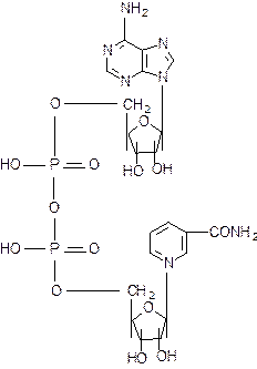 Приведите структурную формулу НАД (никотинамидадениндинуклеотида), покажите составные части.