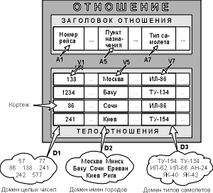 Доменом называется множество атомарных значений одного и того же типа. Так, на рис. 1.1 домен пунктов отправления (назначения) – множество названий населенных пунктов, а домен номеров рейса – множество целых положительных чисел.