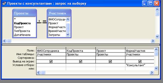 Для поля ФормаУчастия зададим условие отбора «Консультант». В режиме Конструктора[4] запрос примет вид: