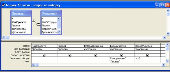 Зададим условие отбора для поля ФормаУчастия «Консультант» или «Лектор», а для поля ВремяУчастия >10.