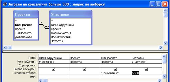 Зададим условия отбора для поля ТипПроекта «Консалтинг», а для поля Затраты - >500.