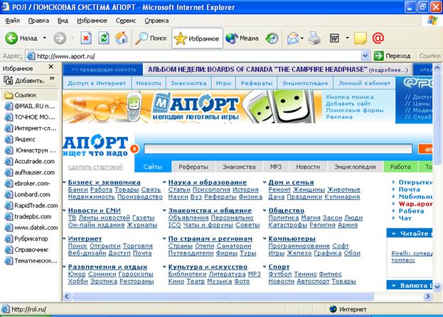 Откроем в браузере Internet Explorer начальную страницу информационно-поисковой системы Апорт[6], введя в адресную строку http://www.aport.ru. Эта страница имеет вид: