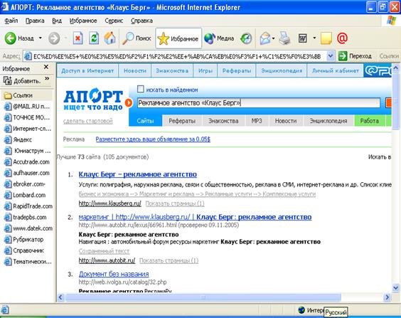 Введем в поисковую строку требуемый текст Рекламное агентство «Клаус Берг». Страница с начальным набором ссылок по теме будет иметь вид: