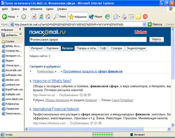 При помощи поискового каталога http://www.list.ru найдем ссылки, касающиеся Экономическая преступность в финансовой системе России. Получим: