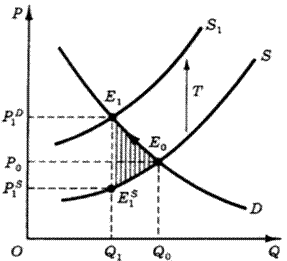Из этого же рисунка видно, что налоговые поступления в бюджет государства не совпадают с величиной налогового бремени - снижением излишков покупателей и продавцов. Поступления в бюджет равны произведению TQ1 и изображаются площадью прямоугольника PS1PD1E1ES1. Эта величина меньше совокупного уменьшения излишков: площадь треугольной области ES1E1E0 (она на рисунке заштрихована) не покрывается величиной налогового сбора. Это - чистые потери общества, обусловленные введением налога.