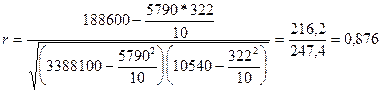 Все необходимые данные для определения коэффициента корреляции есть в таблице, их лишь остается подставить в необходимую формулу.