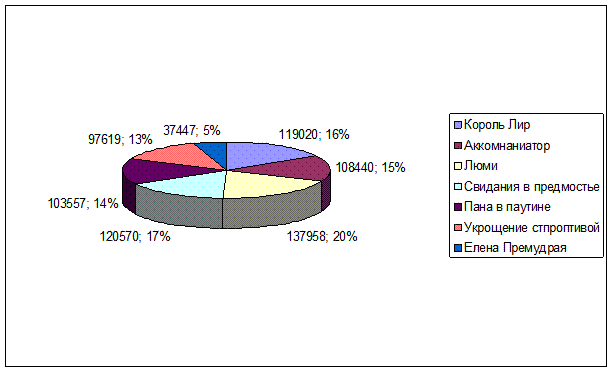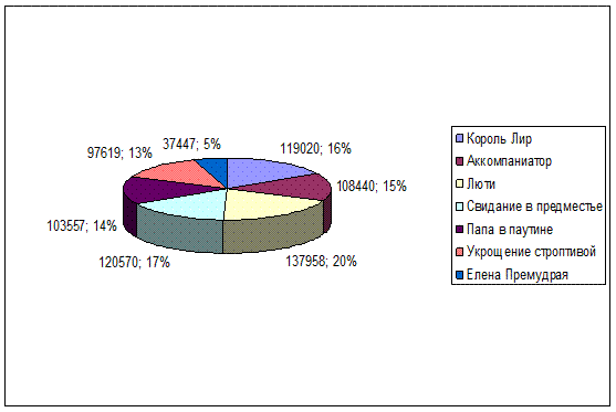 В 2003 году наибольшую долю выручки собрал спектакль «Люми» (20%), а наименьшую – Елена Премудрая (5%).