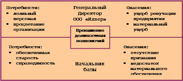 Основной видимой причиной конфликта являлось то, что начальник базы своими самовольными действиями нанес значительный материальный ущерб фирме в размере пятидесяти тысяч рублей, превысив свои должностные полномочия. Как и следовало ожидать, подобное поведение вызвало гнев руководства в лице генерального директора. Наказанный работник и в самом деле считал свое мнение единственно правильным. Однако, согласно закрепленными за его должностью полномочиями, он обязан был согласовать с начальством свои действия (например, отложить принятие решения о выдаче материалов до того момента, когда получит разрешение генерального директора).