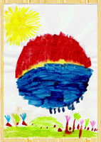 На предыдущей ступени развития, когда изображение предметов только появляется (рисунок по обводке, трафарету - «Весна»), отношение к цвету ограничивается интересом к самим краскам и, порой, изображение не имеет значения. И это верно, ребенок исследует краски, карандаши и их цветовые возможности, это период проб материалов, пригодных для рисования, период развития движений рук. В это период цвет автономен. На данной же ступени, ориентация в цвете идет очень быстро - красный, желтый, зеленый, синий и, что очень важно, цвет соотносится с предметом, раскрашивание становится осмысленным. Замысел уловить пока сложно, сознание не устойчиво и начальные намерения часто меняются. Но здесь уже присутствуют зачатки творчества и это значимо.