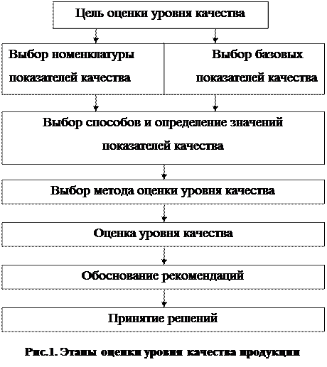 В общем виде оценка уровня качества может быть представлена этапами, отраженными на рис.1.[2] Содержание этапов и объем работ на каждом из них существенным образом зависят от цели оценки качества продукции.