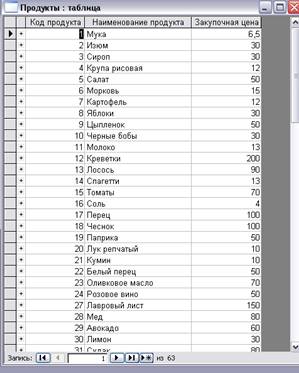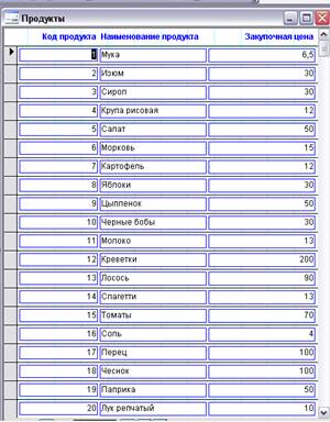 · «Продукты» - содержит сведения о продуктах, которые используются для приготовления блюд (см. рисунок 3).