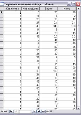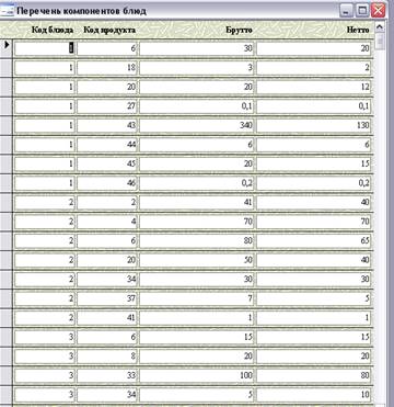 Рисунок 4. Таблица Перечень компонентов блюд»
