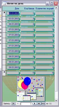· «Меню на день» - включает в себя информацию о названиях блюд, которые запланированы к производству на конкретную дату, и количественные пропорции для каждого из них (см. рисунок 5).