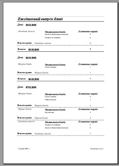 В заключении разрабатывается отчет, содержащий итоговые данные по ежедневному выпуску блюд (см. рисунок 12).