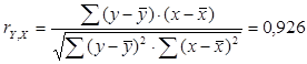 Рассчитаем выборочный коэффициент корреляции по формуле (использована функция КОРРЕЛ Мастера функций Excel):