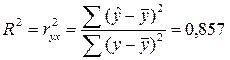 Коэффициент детерминации рассчитывается по формуле (также его можно найти с помощью программы Регрессия надстройки Анализ данных пакета Excel):