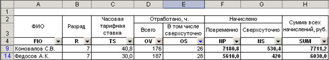 4. С помощью фильтра получить информацию о рабочих кто отработал сверхурочно от 25 до 35 часов.
