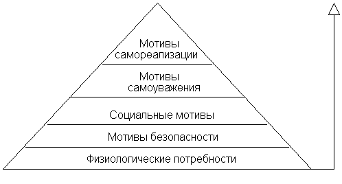 Под мотивом понимают побуждение человеческого поведения, базирующееся на субъективных ощущениях недостатков или личных стимулов. Мотивы человеческого поведения имеют определенную иерархию (она обычно называется "пирамидой Маслоу") - рис.1.