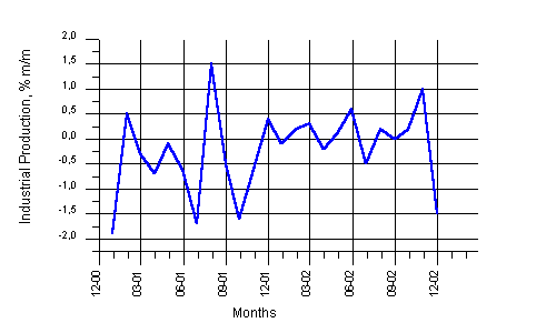 По данным Министерства экономики, торговли и промышленности Японии, в январе промышленное производство в стране увеличилось на 1,5% по сравнению с предыдущим месяцем. Однако в феврале, по оценке правительства, данный показатель упал на 0,4%. Экономисты, опрошенные Bloomberg News, в среднем прогнозировали рост производства в январе на 1,0% по сравнению с декабрем. По сравнению с январем 2002 года объем производства в Японии увеличился на 6,8%. Другой экономический отчет правительства Японии показал, что расходы рабочих, получающих зарплату выросли на 3,6% в январе по сравнению с декабрем. В целом, потребительсике расходы в стране в прошлом месяце снизились на 2,0%.