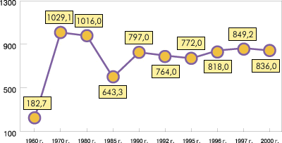 На рис. 2 показано производство нефти за период 1960 -2000 гг. Из рис. 2 видно колебание производства нефти, По сравнению с 1960 г. производство нефти значительно возросло. Особенно высокий скачок наблюдается 1970 г., а за последние 10 лет колоебания незначительные.