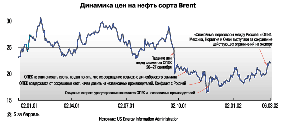 Рис. 9. Мировые цены на нефть в феврале 2003 года (марки Brent и WTI).