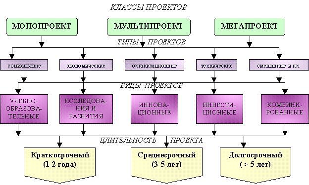 - мегапроект – целевые программы развития регионов, отраслей и других образований, включающие в свой состав ряд моно- и мультипроектов.