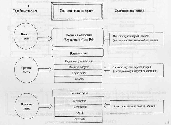 Военные суды образуют единую систему, состоящую из трех звеньев. Низшее звено составляют гарнизонные военные суды, второе (среднее) звено окружные (флотские) военные суды, а высшим звеном для военных судов является Верховный Суд РФ, в состав которого входит Военная коллегия.