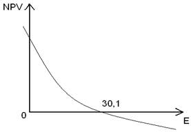 Вывод: Проекта в целом эффективный об этом говорят показатели NPV для проекта и заказчика, что подтверждается также расчетом ИДДЗ, ИДД которые имеют значение более 1 для обеих случаев (проекта, заказчика). Для оценки эффективности проекта необходимо рассчитать значение Е при котором ЧДД (IRR) проекта обращается в «0». Судя по графику построенному для различных расчетных значений нормы дисконта для данного проекта равен 30,1, для заказчика 36,23 значение Е при котором ЧДД принимало бы положительное и нулевое значение, что еще раз подтверждает эффективность проекта. Срок окупаемости, то есть период в течение которого текущий чистый доход становиться неотрицательным для проекта 4 года, для заказчика через года.