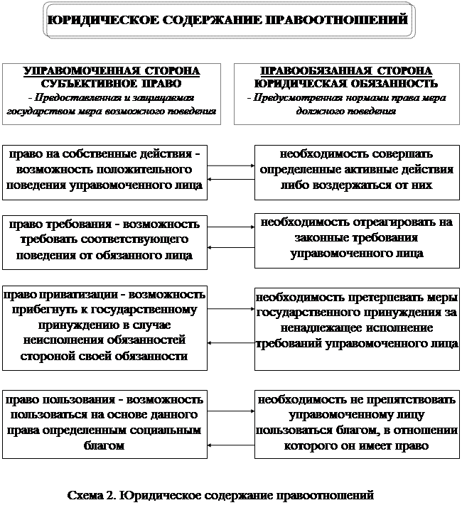 Основное, юридическое содержание правоотношения составляют права и обязанности его субъектов, понимаемые как возможность определенных действий управомоченного лица и необходимость действий или воздержание от них обязанного лица. Наряду с этим выделяют и фактическое содержание правоотношения, которое включает в себя и действия (поведение), в которых осуществляются права и обязанности. Однако в дальнейшем речь пойдет о юридическом содержании, элементами которого являются корреспондирующие друг с другом субъективные права и юридические обязанности.