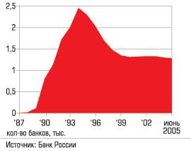Сокращение количества российских банков - закономерный процесс. Дело не в том, что «банков слишком много» (см. рис. 2.1.) Тенденция объясняется трансформацией обстоятельств и интересов, смещением деятельности банков в сторону собственно банковского бизнеса, ориентацией на классические банковские услуги, на которые многие банки вовсе и не были рассчитаны. Процесс массовой приватизации закончен, заниматься «неформальной» деятельностью все менее выгодно и более опасно. Соответственно, объем продаж банков все большей степени зависит от рыночного (платежеспособного) спроса на классические (легитимные) услуги, конкурентоспособно оказывать которые способны не все.
