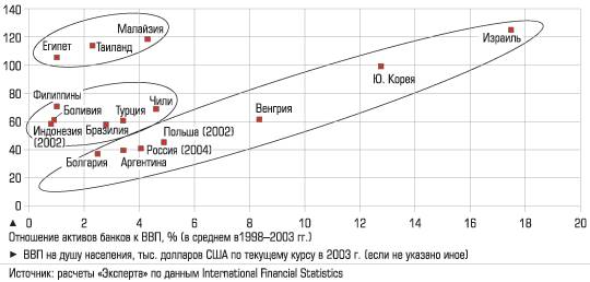 Российская банковская система остается слаборазвитой - даже на фоне стран с аналогичным уровнем развития. Целый ряд стран, имеющих близкий нашему показатель среднедушевых доходов в 4-5 тыс. долларов по текущему курсу, имеют гораздо больший вес банковского сектора в экономике. Так, суммарные банковские активы в Бразилии, Турции и Чили составляют 60-70% ВВП, в Таиланде и Малайзии -- 120% ВВП (см. рис. 2.2.).