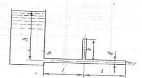 При истечении жидкости из резервуара в атмосферу по горизонтальной трубе диаметром d=40 мм и длиной 2l = 4 м. Уровень в пьезометре, установленном посередине трубы, равен h=3 м. Определить расход Q и коэффициент гидравлического трения l, если статический напор в баке постоянен и равен Н. Построить пьезометрическую и напорную линии. Сопротивлением жидкости в труб пренебречь.