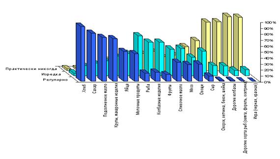 Продукты, которые покупаются «время от времени». В эту группу вошли рыба, колбасные изделия, фрукты, сливочное масло, мясо и овощи.