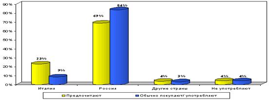 Как видно из рисунка 7, наиболее популярными у отечественных потребителей являются российские и итальянские макаронные изделия. В категории «другие страны» можно выделить три страны: Германия (1% опрошенных предпочитают макаронные изделия этой страны и 0,5% обычно покупает/употребляют), Турция (1% опрошенных предпочитают и 1,2% регулярно употребляют), Польша (1,1% и 1% соответственно); остальные страны были названы менее чем 0,5% опрошенных.