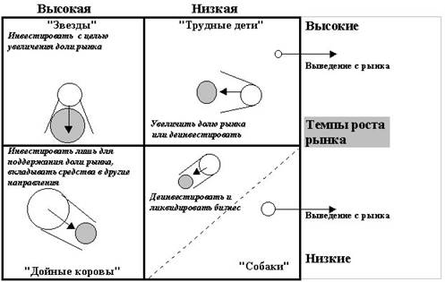 Одной из самых распространенных моделей портфельного анализа является матрица Бостонской консультационной группы (Boston Consulting Group — БКГ), называемая также матрицей “рост — доля рынка”, поскольку в качестве координат здесь берутся показатели относительной доли рынка и темпов роста отраслевого рынка (рис. 2).