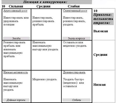 Предложенная компанией General Electric и консалтинговой фирмой McKincey, матрица “привлекательность отрасли — позиция в конкуренции” свободна от некоторых недостатков, присущих матрице Бостонской консалтинговой группы. В частности, в отличие от матрицы БКГ, здесь вместо двух градаций по каждой из осей вводится три, и, таким образом, получается матрица 3х3, рассматриваемая в двумерной системе координат “привлекательность отрасли — позиция в конкуренции”.