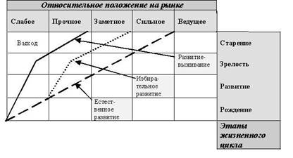 Модель “ADL/LC” (Arthur D. Little / Life Cicle) является одной из наиболее распространенных моделей, использующих понятие жизненного цикла бизнес-единицы или отрасли. Здесь предполагается, что любой бизнес последовательно проходит в своем существовании этапы рождения, развития, зрелости и спада. Анализ позиции конкретного бизнеса проводится в координатных осях “стадия жизненного цикла продукта — относительное положение на рынке (конкурентная позиция бизнеса)”. Согласно модели, относительное положение бизнеса на рынке может быть ведущим, сильным, заметным, прочным, слабым. Таким образом, получается матрица 4х5 (рис. 4). Процедура выбора стратегических решений складывается из трех шагов. На первом шаге стратегия предварительно и в общей форме определяется в соответствии с тем, какую клетку матрицы занимает данный конкретный бизнес. На втором шаге учитывается позиционирование бизнеса внутри данной клетки матрицы. В зависимости от позиции здесь осуществляется выбор линий дальнейшего движения бизнеса и конкретизация стратегий, хотя формулировки стратегий здесь также носят еще достаточно общий характер. Для каждой из ячеек матрицы существуют свои возможные стратегические маршруты по линии естественного развития или линии избирательного развития (рис. 4), и, соответственно выбору, свой набор уточненных стратегий. Поэтому на третьем шаге осуществляется выбор уточненной стратегии, соответствующей выбранному пути развития бизнеса. Здесь для каждой из возможных ситуаций предлагается конкретный набор комбинаций из 24 уточненных стратегий, причем последние формулируются в терминах хозяйственных операций .