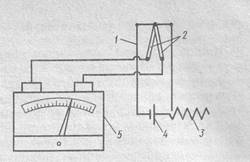 1 – датчик, 2 – термопара, 3 – реостат, 4 – батарея нагрева, 5 – гальванометр