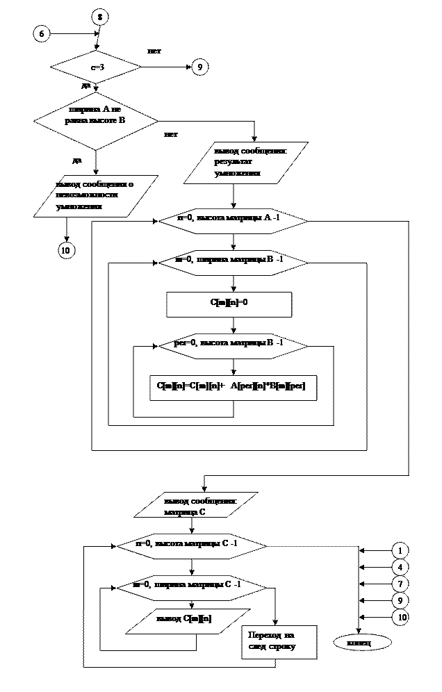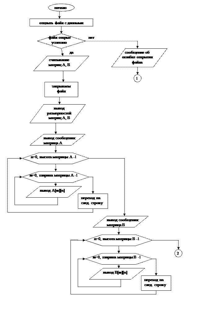 Нарисуйте детальную блок-схему алгоритмов сложения, вычитания и умножения матриц и реализуйте эти алгоритмы в одной программе. Программа должна выводить исходные матрицы и результаты матричных операций на экран, при этом исходные матрицы должны содержаться в файле на диске.