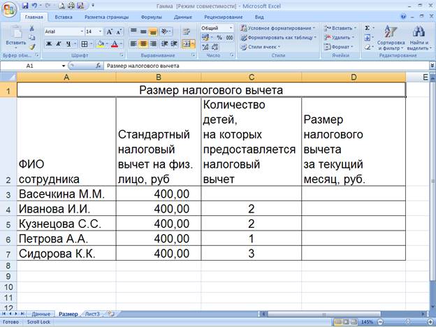 7. На рабочем листе Размер MS Excel создать таблицу «Размер налоговых вычетов, предоставляемых сотрудникам в текущем месяце».