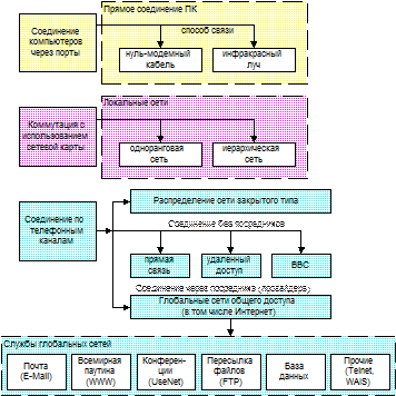Рисунок 1 - Способы коммутации компьютеров и виды сетей.