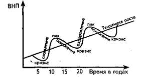 Циклический характер развития капиталистической экономики означает, что быстрый рост производства через определенный промежуток времени сменяется столь же быстрым его падением. По всеобщему признанию, классический цикл имеет четыре фазы: кризиса (рецессии, спада), депрессии (стагнации), оживления (экспансии), подъема (бума, пика). Следовательно, экономическим циклом является процесс прохождения рыночной экономики от одной фазы до следующей такой же. Например, от кризиса до кризиса или от подъема до подъема.[2]