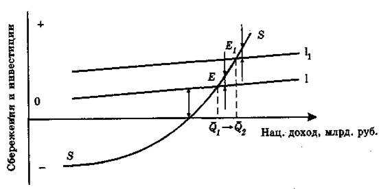 Из представленных на рис. 2 кривых сбережений и инвестиций, фиксирующих связь указанных параметров с изменением национального дохода, хорошо видно, что чем выше спрос на инвестиции (I1 по сравнению с I) и шире возможности институциональных инвесторов в обеспечении равенства I — S, тем выше совокупный спрос на национальный продукт, а следовательно, сильнее стимулы к росту национального дохода (продукта) в последующие воспроизводственные периоды. Точки Е и Е1 отражают состояния равновесия между этими (I и S) ключевыми параметрами и соответствующие им равновесные величины создаваемого и распределяемого национального дохода Q1 Q2.