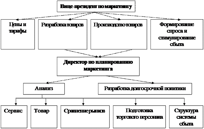 Организационная структура управления отделом маркетинга, в основу которой положен товарно-функциональный принцип, имеет следующий вид.