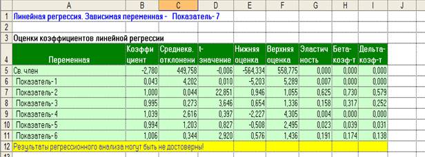 Для определения тесноты связи между текущей k-й переменной и оставшимися (объясняющими) переменными, используется выборочный множественный коэффициент корреляции. Для проверки статистической значимости коэффициента множественной корреляции используется величина F. Если рассчитанное F-значение больше значения F-распределения на соответствующем вероятностном уровне (0,9 и выше), то гипотеза о линейной связи между k-й переменной и остальными переменными не отвергается. В нашем случае табличное значение F5,5=5,05, а значит только для третьего показателя гипотеза об отсутствии линейной связи с остальными переменными отвергается.