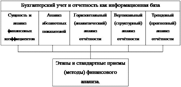 Бухгалтерская отчетность является информационной основой финансового анализа, на основе которой определяются этапы и используются методы финансового анализа. На рис. 1.1. представлены этапы и стандартные приёмы финансового анализа на основе бухгалтерского учёта и отчётности предприятия.