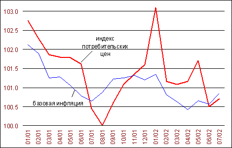 В период с 1996 года до конца августа 1998 года в России наблюдалось снижение темпа инфляции. Валютно-финансовый кризис, разразившийся вслед за другими странами в России в августе 1998 года, показал эфемерность официально объявленной финансовой стабилизации и победы над инфляцией. Глубокие экономические и социальные потрясения в их числе: замораживание выплат по внутренним и внешним долгам; крах рынка ценных бумаг и финансовых пирамид; блокирование вкладов в крупных банках, кризис банковской системы и безналичных расчетов; увеличение безработицы; «бегство» капитала за рубеж; девальвация рубля привели к усилению инфляции с 11 % в 1997 году до 70 % в 1998 году. В 1999 году темп инфляции составил 36,5 %. Замедление темпов инфляции было обусловлено снижением платежеспособного спроса в связи с падением реальных располагаемых денежных доходов населения (в декабре 1998 г. на 31,8 % по сравнению с декабрем 1997 г.), контролем за денежной эмиссией и динамикой денежных агрегатов относительной стабилизацией валютного курса рубля. В июле 2002 года на потребительском рынке не произошло ожидавшегося сокращения динамики цен, не говоря уже об их абсолютном снижении. Хотя инфляция, в общем-то, невелика, обращает на себя внимание ее тенденция: вместо сезонного спада, индекс потребительских цен даже чуть вырос – со 100.5% в июне до 100.7% в июле (2001 г., соответственно: 101.6% и 100.5%). Базовая инфляция тоже несколько увеличилась – со 100.6% до 100.9% (самый высокий уровень, начиная с января) – график №1. Такая динамика цен определялась в основном конъюнктурными факторами(12).